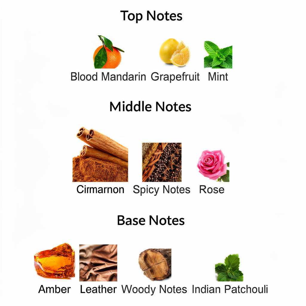 Golden Vault Perfume is a bold woody-spicy fragrance for men, featuring a striking blend of freshness and warmth. This men’s perfume opens with zesty blood mandarin, grapefruit, and cool mint, leading into a heart of cinnamon, spicy accords, and a hint of rose. The scent settles into a rich base of amber, leather, woody notes, and Indian patchouli, creating a powerful, confident trail that makes this perfume perfect for evenings and special occasions.